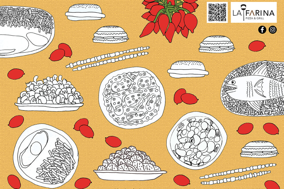 Tovagliette e immagini per Menù realizzate per il ristorante La Farina Pizza e Grill di Firenze